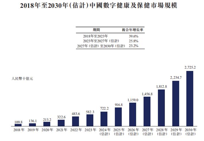 根据弗若斯特沙利文的资料,中国数字健康及保健市场规模由2018年的1098亿元增加至2023年的5823亿元,复合年增长率为39.6%。预期市场规模将由2023年的5823亿元增加至2027年的1.46万亿元,估计复合年增长率为25.8%。沙利文预期该市场规模将于2030年进一步达到2.7万亿元。