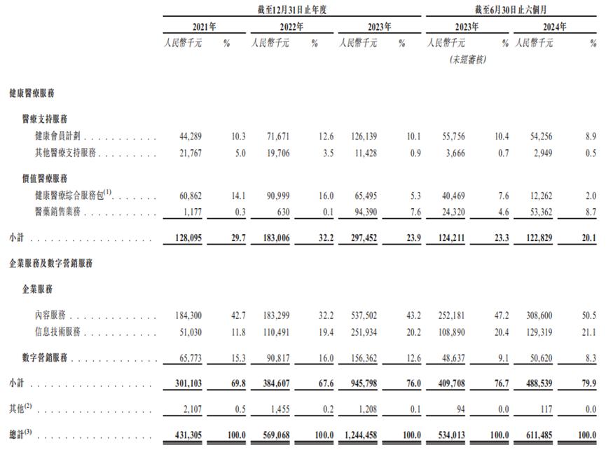 健康医疗服务是面向个人用户的,报告期内,这项业务的占比先升后降,2024年上半年占比为20.1%。