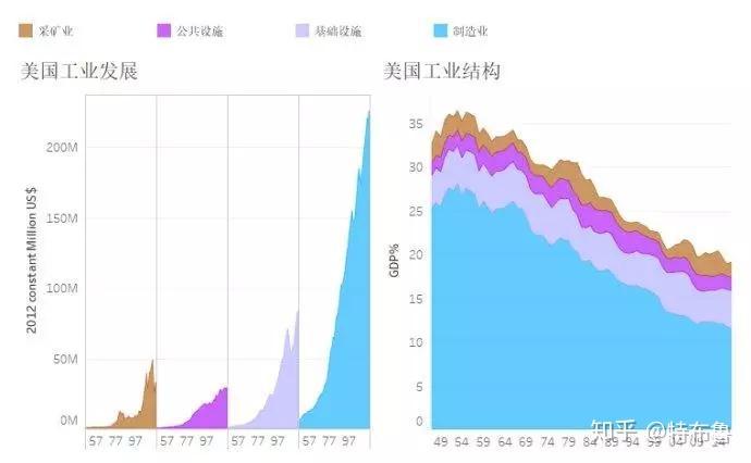 从产业结构看,1880年美国已经成为了全球制造业第一大国,到1953年,制造业在美国GDP的占比已经高达28%,是历史的最高水平。可是该占比自1953年起震荡下行,到2017年,美国的制造业占GDP的比例已经不足11.2%。