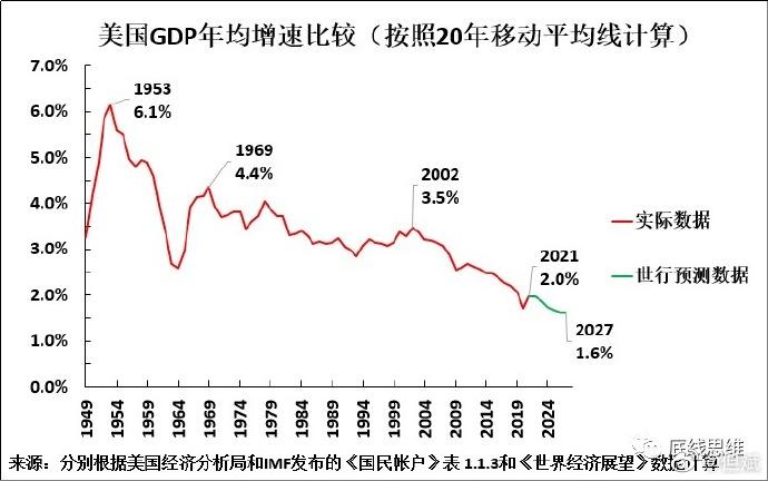 美国经济学家戈登把1928年到1960年成为“大跨越”时代,尤其是大萧条过后的1933年到1945年二战结束,美国经济平均增速高达9.3%。此后的一个经济周期中,美国GDP增速从1949年的不足3.5%,一路飙升到1953年的6.1%,到1969年再次回落到4.4%,美国经济的高增长到上世纪70年代戛然而止,之后经济增速大幅回落,只有之前50年增速的三分之一,到2023年更是下降到2%左右。回顾历史,1953年是上世纪中叶以来美国经济增长的高峰。