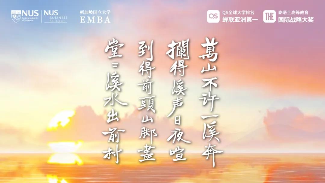 新加坡国立大学中文 EMBA,坚持以中文传达人类共通的价值,为华人商界精英打开通向世界的窗口。我们呼唤诸位同学与中文 EMBA 社群中的朋友,来共同承担这个特殊时代所赋予我们的责任,延续华人未完成的现代化使命,以各自的方式来探索华人文明与世界共存的方式。