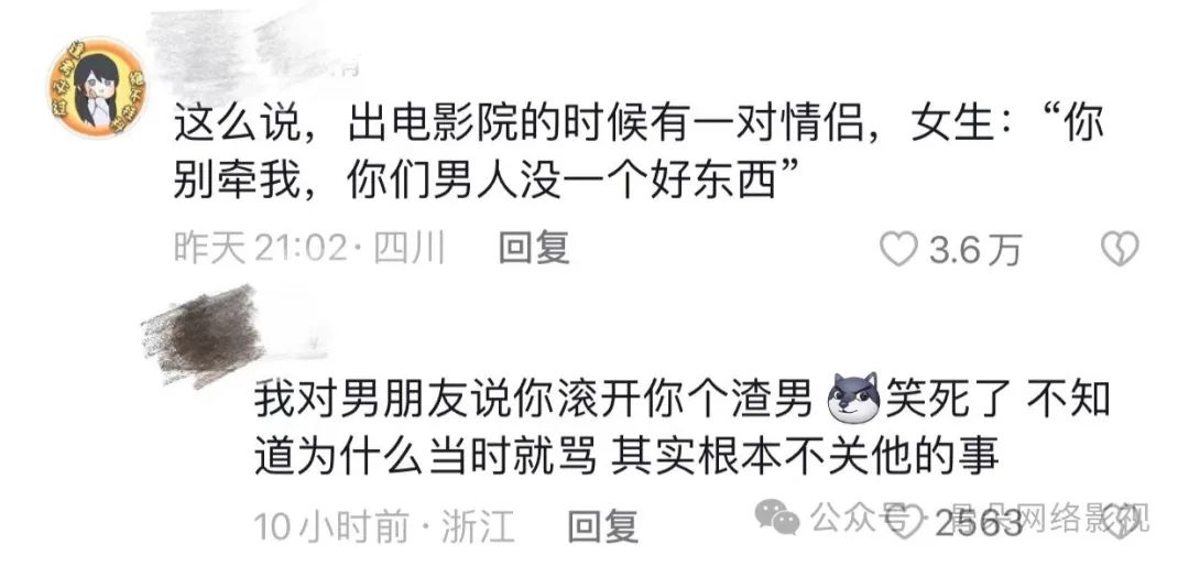 而去年暑期档爆火的《消失的她》,更是吃到了性别对立的红利,这个电影本身就取材了泰国孕妇坠崖案的真实故事,用凤凰男对白富美妻子的欺骗和杀害,激发了女性观众对男性群体的强烈愤怒,有女观众出场就对男朋友说,你们男人没一个好东西!这种对极端亲密关系丑恶面的展现,也会在舆论发酵中加剧性别对立,让人们更难以相信爱情。