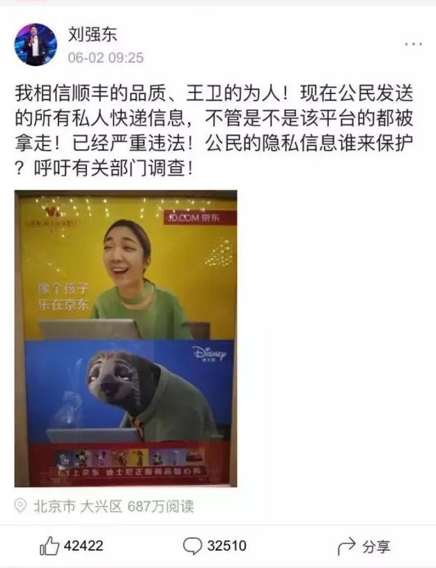 几乎同一时间,东子立马慷慨发声:“ 相信顺丰的品质、王卫的为人 ”,然后宣布京东全面接入丰巢自提柜。