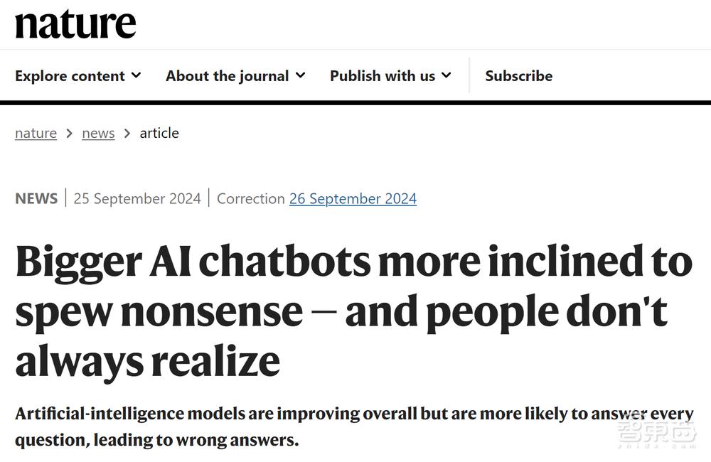智东西9月29日消息,国际顶尖科学学术期刊Nature(《自然》)9月25日刊登了一篇有关AI大模型“脑雾”现象的研究。一个来自西班牙的研究团队发现,几个参数量更大、版本更新的AI大模型,误答比例超60%。