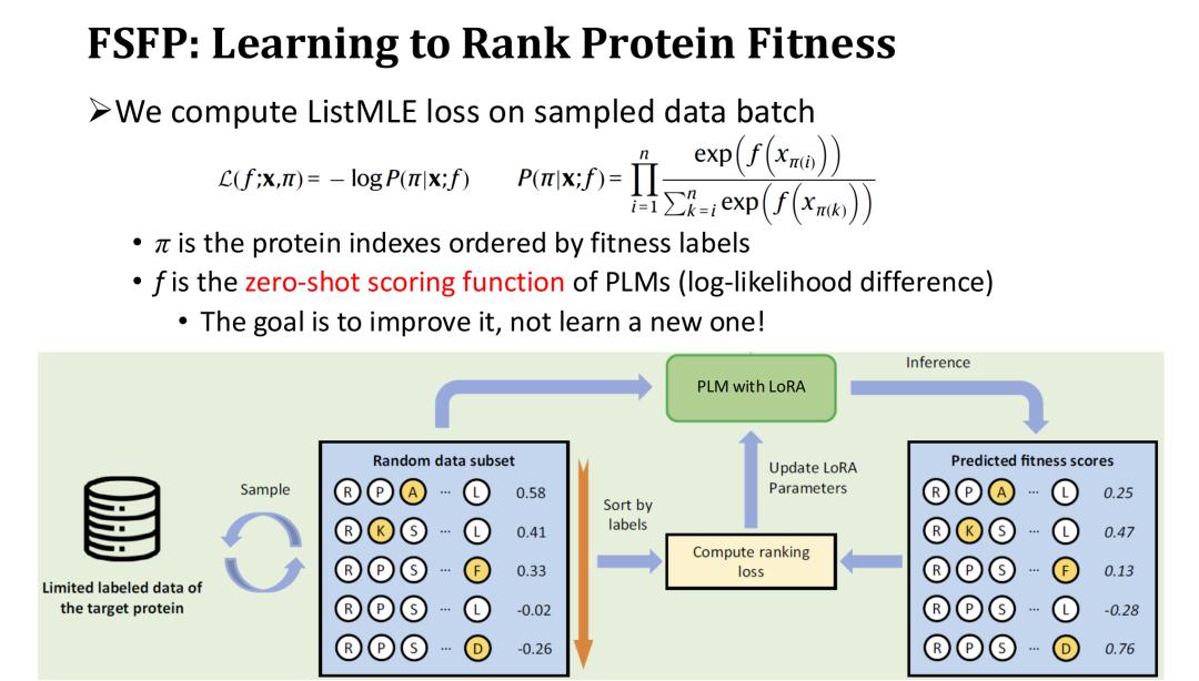 如何将元学习应用到 Fitness 预测的场景?首先我们的目标任务是对目标蛋白质的突变做 Fitness 排序,而要训练的模型是采用了 LoRA 技术的 PLM。
