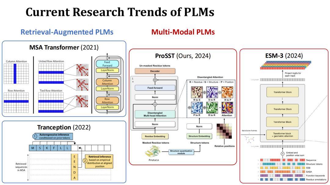 其次是多模态 (Multi-Modal) PLM,这类模型除了蛋白质序列外,还将蛋白质的结构或其他信息作为额外输入,以增强模型的表征能力。例如,我们课题组今年投稿的 ProSST 模型,将蛋白质结构量化为结构 token 序列,并与氨基酸序列一起输入 Transformer 模型,通过分离注意力机制来融合这两类信息。另一个例子是同期的模型 ESM-3,它考虑的信息更丰富,包括氨基酸类型、完整三级结构、三级结构 token、二级结构、溶剂可及表面积 (SASA),以及蛋白质和残基的功能描述共 7 种输入。