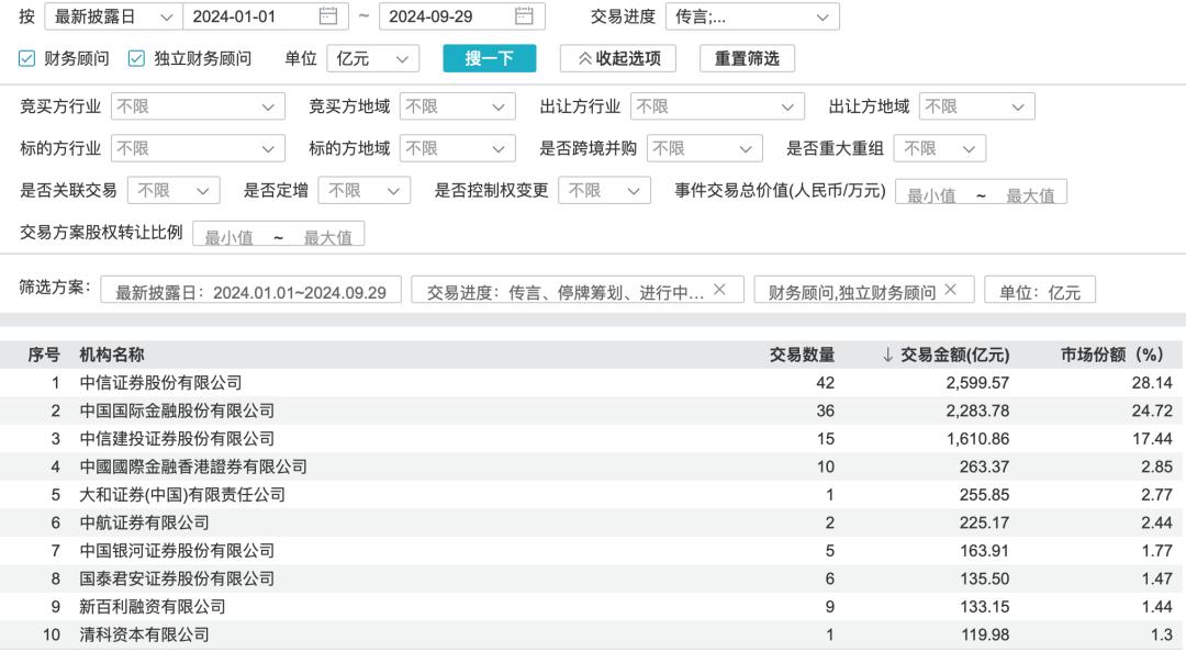 若是按最新披露日计算,手上有并购项目正在进行且今年以来截至9月29日有披露进展的,仍是上述三家头部券商占据了绝大半市场份额。其中,中信证券市场份额28.14%,中金公司24.72%(未包含中金香港),中信建投17.44%。