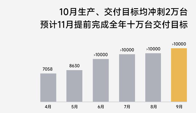 目前,小米汽车月交付量已连续四个月破万。从官方公布的销量柱状图案的长度来看,小米汽车9月的交付量或许有了较大提升。
