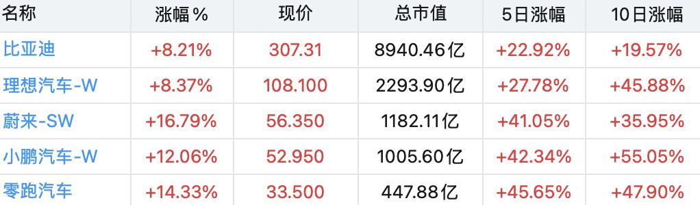 销量的增长以及最近政策的利好,带动了“蔚小理零”以及比亚迪的股价上升。近10个交易日,理想、小鹏、零跑的股价涨幅均在45%以上,蔚来、比亚迪股价也分别有35%、20%涨幅。