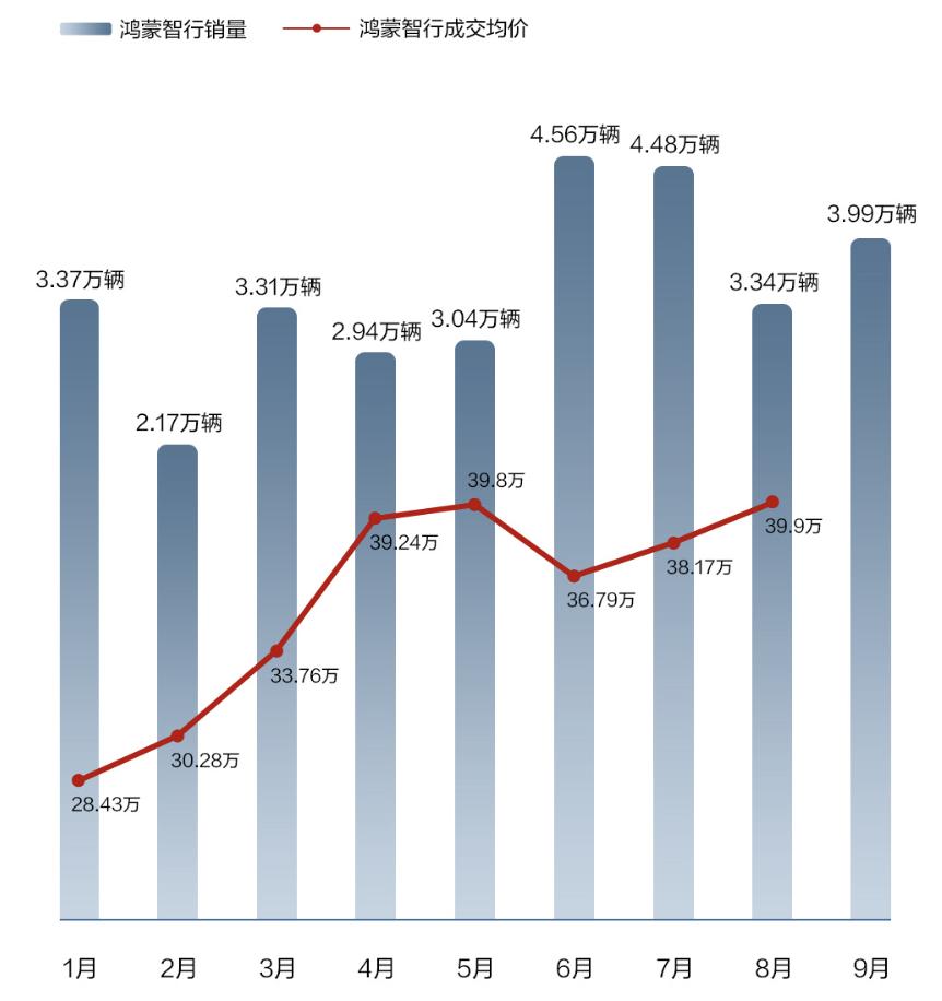 鸿蒙智行在9月交付39931辆新车,官方表示其连续5个月蝉联中国汽车品牌终端成交均价TOP1。