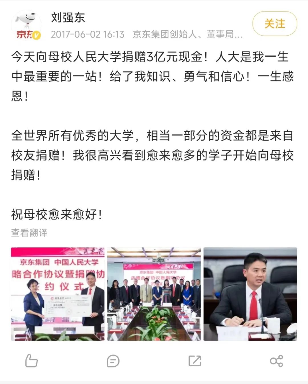 同在2017年6月,刘强东也宣布向人大捐赠3亿元,设立中国人民大学京东基金。这一日,刘强东在微博写道,“京东今天向母校人民大学捐赠3亿元现金!人大是我一生中最重要的一站!给了我知识、勇气和信心!一生感恩!全世界所有优秀的大学,相当一部分的资金都是来自校友捐赠!我很高兴看到愈来愈多的学子开始向母校捐赠!祝母校愈来愈好!”