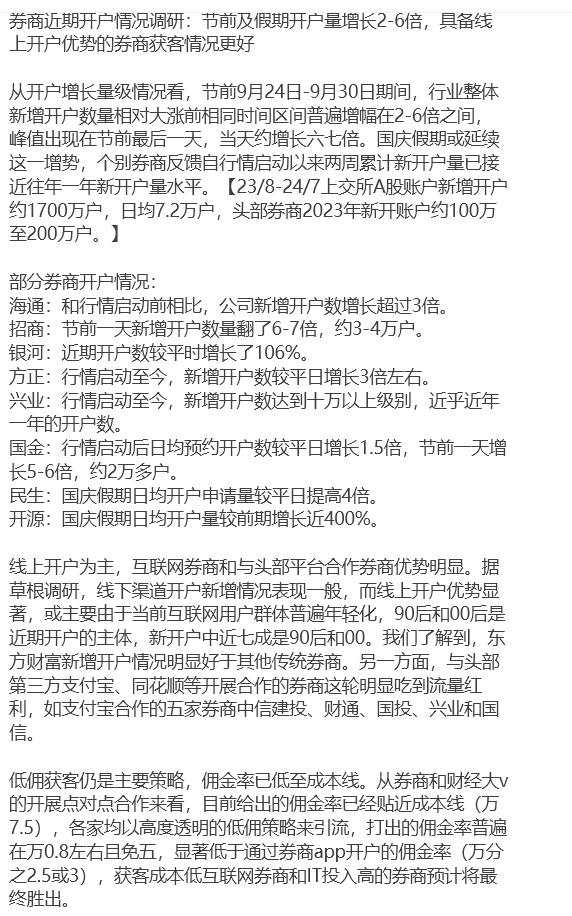 得益于线上能力的前期布局,有华南头部券商透露了线上开户的优秀战绩,例如:9月30日当天开户达4万,其中线上开户3万,是平时线上开户的50倍,3万户的线上开户达成了线下的3倍;华鑫证券假期实现申请开户数比去年同期增长25倍,且出现大量首次新开证券账户的新股民。线上流量客户成为开户主力军,占据90%的新开户份额。不过关于网传段子提到的“获客成本低的互联网券商和IT投入高的券商预计将最终胜出”结论,也仍待进一步市场及实践验证。