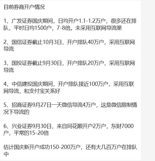 一是节前9月24日-9月30日期间,行业整体新增开户数量相对大涨前相同时间区间普遍增幅在2-6倍之间,峰值出现在节前最后一天,当天约增长六七倍。国庆假期或延续这一增势,个别券商反馈自行情启动以来两周累计新开户量已接近往年一年新开户量水平。