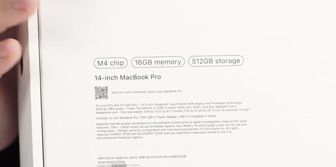在画面里,他向观众展示了一台 14 英寸的 MacBook Pro 包装,根据包装背面的标识显示,这是一台配备 10 核 CPU 与 10 核 GPU M4 芯片的 MacBook Pro,拥有 16GB 内存、512GB 存储空间以及三个雷雳 4 接口以及深空黑配色。