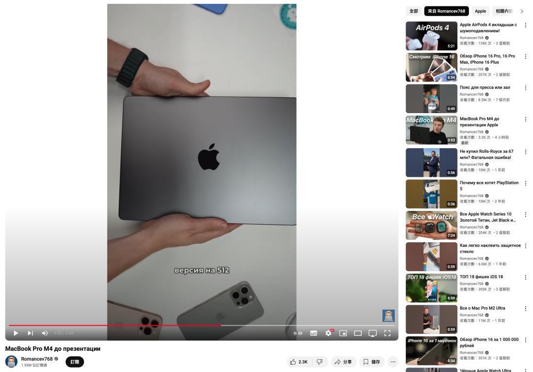 没错,这家来自俄罗斯的科技自媒体,直接上传了一个清晰度高达 4K 的开箱视频,犹抱琵琶半遮面的 MacBook Pro M4 就这么水灵灵地出现在互联网上。
