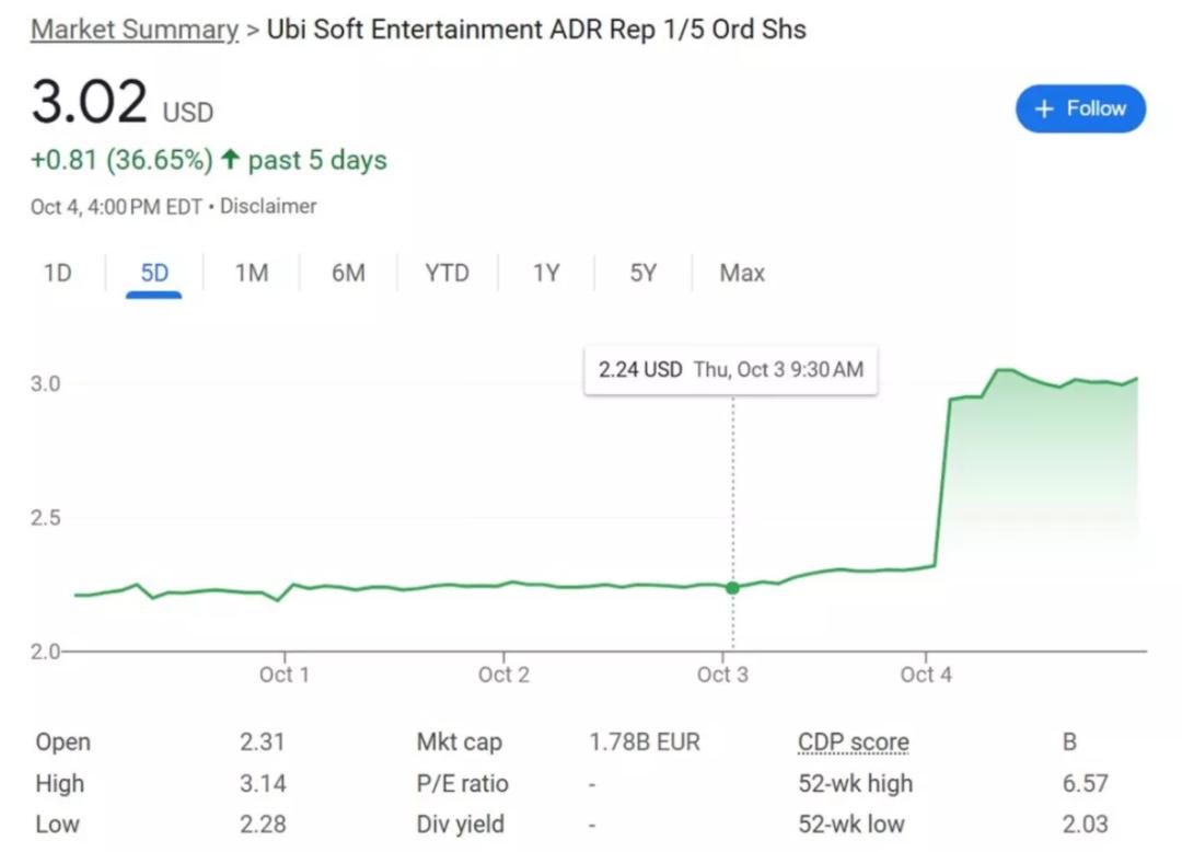 在一片悲观情绪中,有关育碧可能被私有化的消息为这家公司带来了新的希望。据彭博社报道,中国科技巨头腾讯控股正与育碧创始人家族Guillemot家族探讨将公司私有化的可能性。这一消息迅速在市场上引起了强烈反响,当地时间上周五巴黎上市的育碧股票收涨33.52%,创下了自1996年以来单日最大涨幅。市场的积极反应表明,投资者对这一潜在交易持乐观态度,认为私有化可能会为育碧带来新的机遇。
