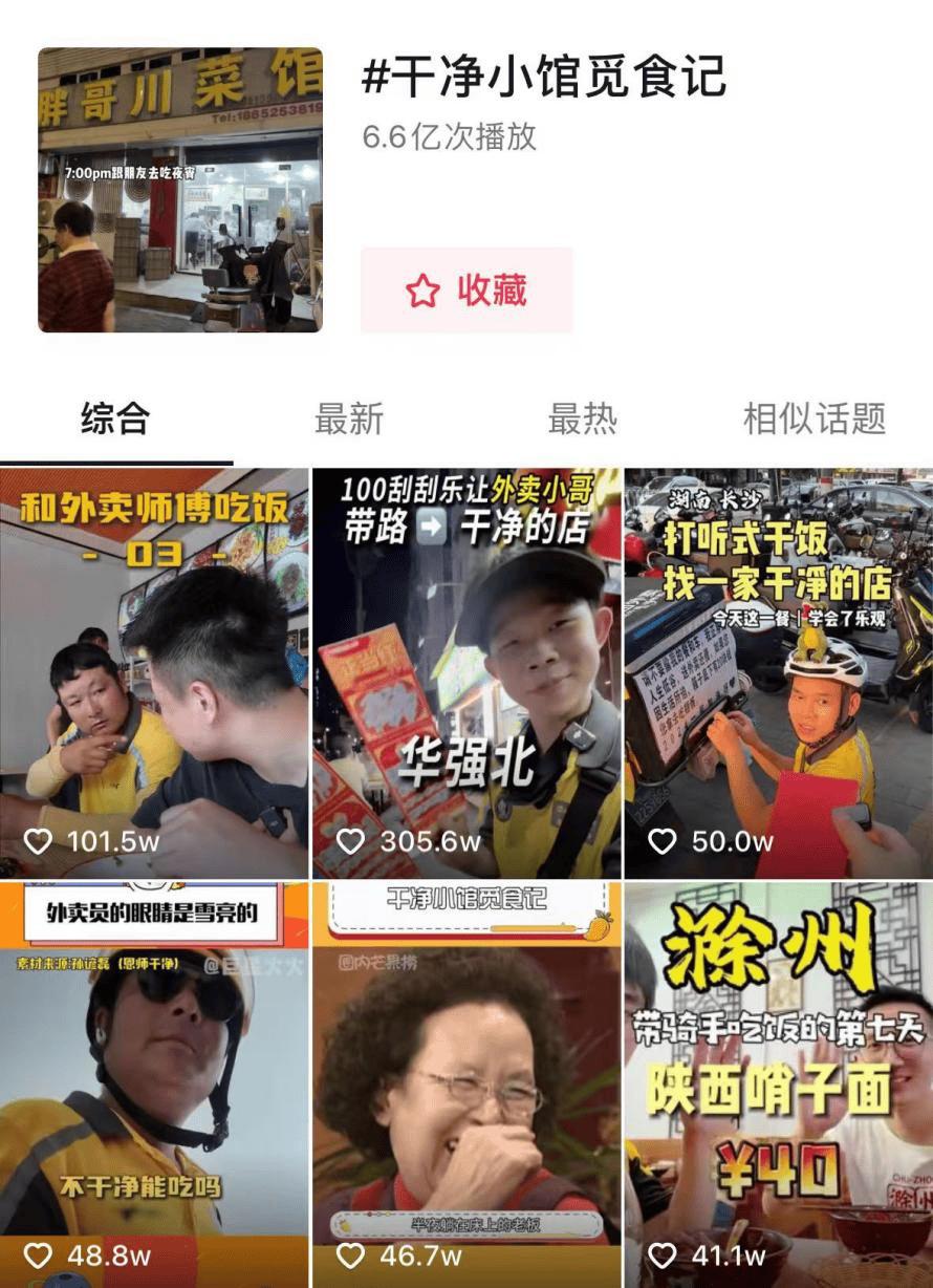 “给您一百块钱,您带我去一个您送外卖遇到过的比较干净的小馆子。”近期,抖音出现了一个名为“干净小馆觅食记”的话题,这类视频的内容就是在街头随机找一位外卖师傅,跟着他们吃一顿他们认为比较干净的馆子。目前,抖音相关话题“干净小馆觅食记”已经有了2.3万次参与,6.6亿次播放。