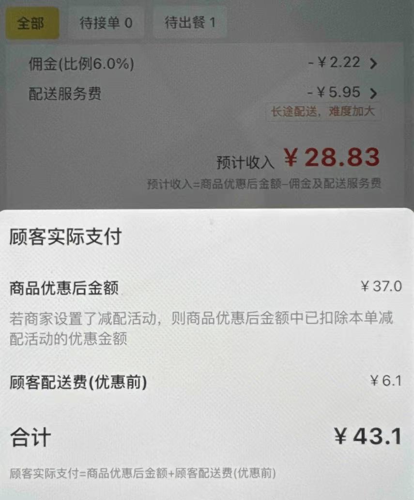 与此同时,外卖平台的抽成和推广费用也是商家的一大负担,一般小商家根本无法承受。从美团一商户商家端的订单详情来看,顾客实付金额扣除外卖平台佣金,以及配送服务费等其他杂七杂八的费用之后,商家到手所剩无几,该商家还向「市象」表示,平台的活动补贴也都是商家承担的。