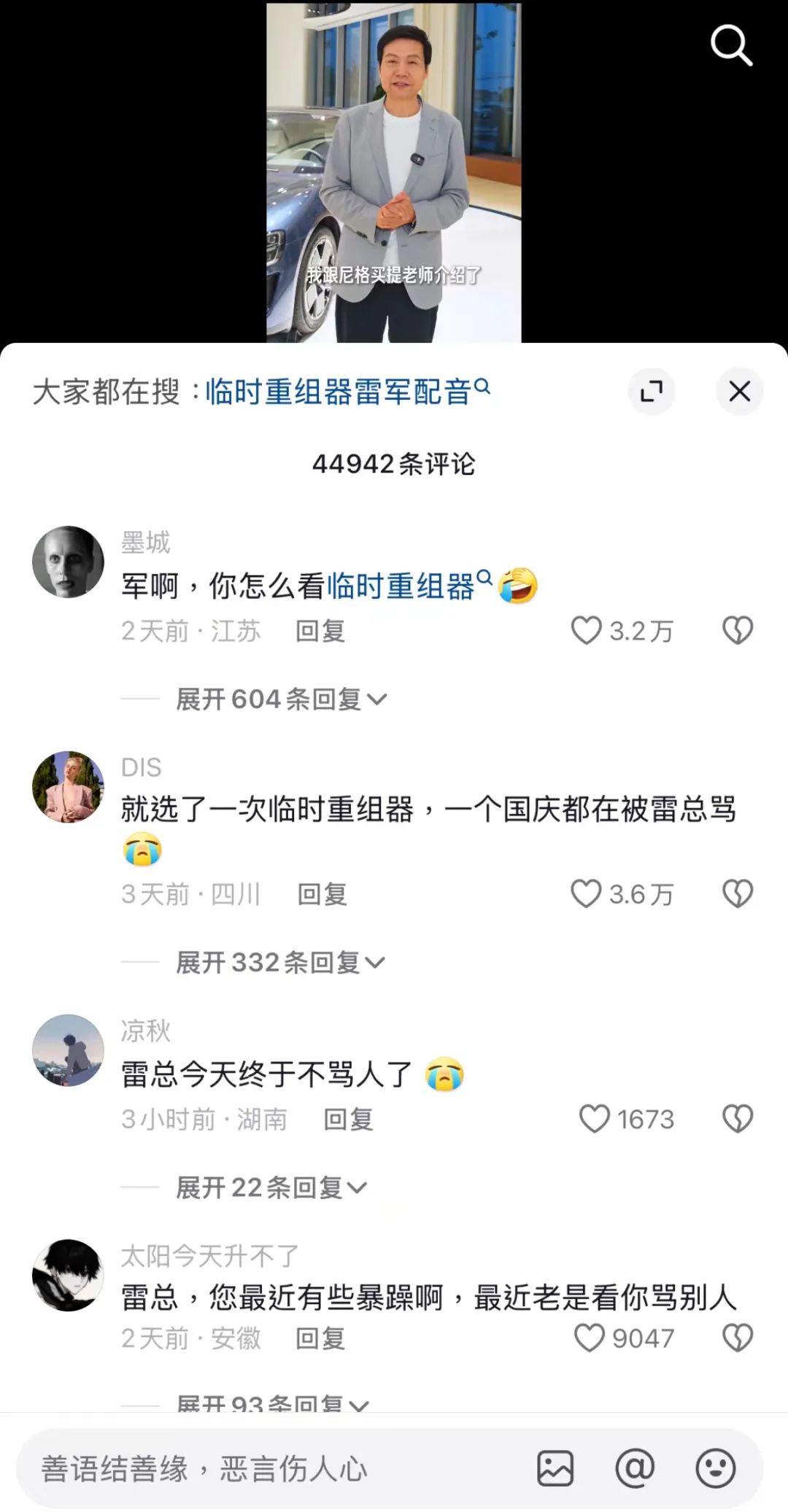 国庆期间,小雷的抖音首页几乎被雷军的AI语音包刷屏。视频中的“雷军”用熟悉的口音带着些许不耐烦的语气,戏谑地吐槽:“这游戏做成这样,绝对是来捣乱的!”由于这些用词与雷军本人十分相似,评论区也常有人问到:“这真是雷军本人说的吗?”