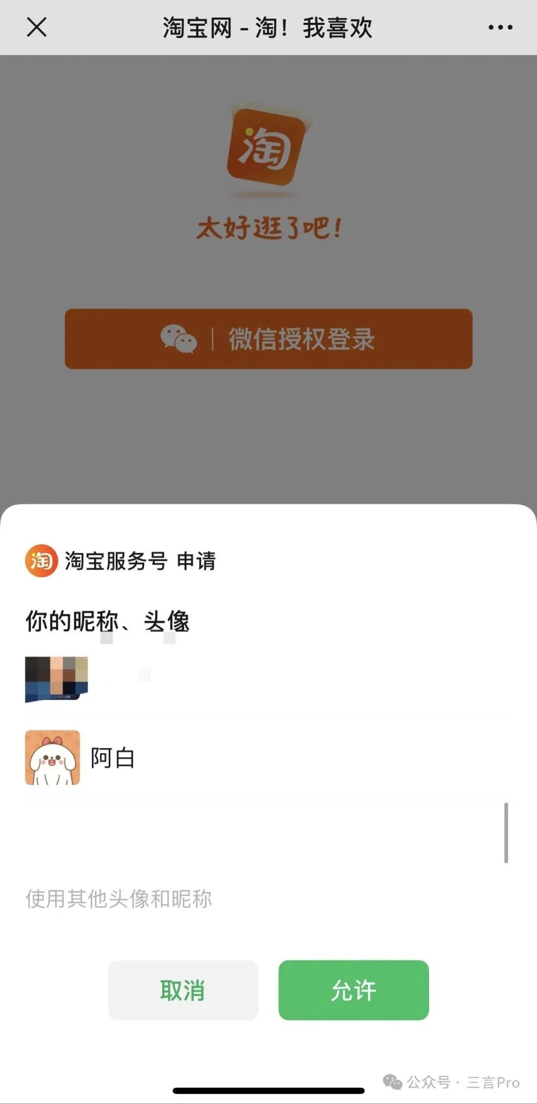 选择微信昵称头像后,会提示绑定淘宝和微信账号。绑定后,就可以在微信端完成支付,收货地址也是淘宝里自己设置的地址,直接选择就好,至此实现了微信里进行淘宝购物的操作。