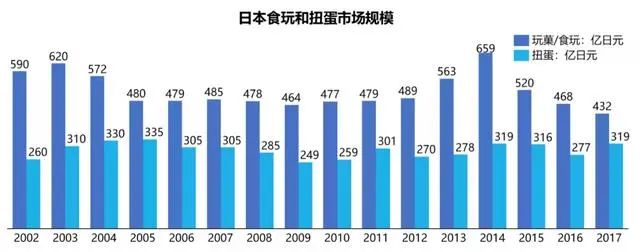 早年,日本食玩(しょくがん,shokugan,玩具菓子,玩菓)市场规模一直由日本玩具协会统计,2017年的数字是432亿日元。