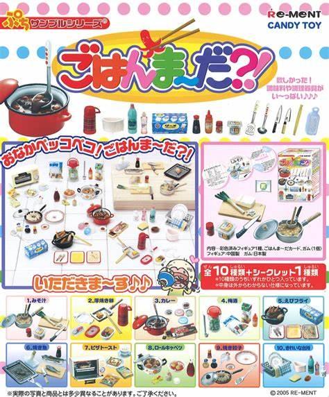 2005年发售的“饭还没好吗?!”,便是畅销款之一,包括调味料、烹调器具、各种料理等,味增汤、厚煎鸡蛋、烤鱼、披萨吐司、咖喱、卷心菜卷、梅酒、煎饺、炸虾、洗盘子时使用的物品等,做得十分细致,深受女性消费群体的喜爱。