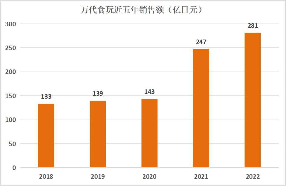 根据万代自己发布的数据,2022年它的食玩销售额281亿日元,市场占比达56.1%。