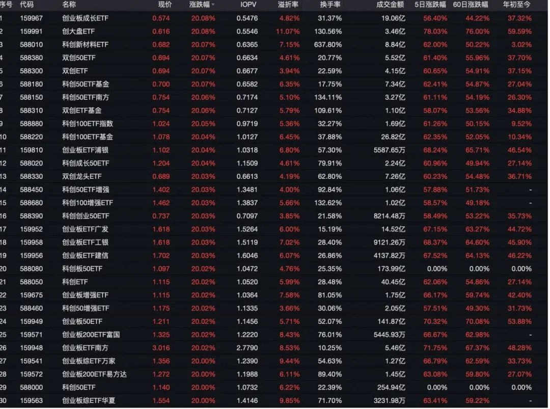 双创主题有量也有价,全市场78只创业板主题、科创板主题等“双创”主题ETF牢牢封在涨停板,20CM大长腿才是资金源源不断买入的原因。值得注意的是,在指数创业板、科创板涨幅均为17%,涨停的ETF几乎全出现溢价,甚至有ETF溢价超过10%。