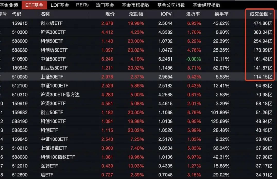 其中,易方达创业板ETF成交额达到474.86亿,华泰柏瑞沪深300ETF成交额383.04亿,华夏科创50ETF成交额254.94亿,易方达科创板50ETF成交额173.99亿,均创下单日成交量新纪录。此外,南方中证500ETF、易方达创业板50ETF以及华夏上证50ETF成交额突破百亿。