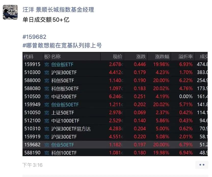 就连创业50ETF基金经理汪洋收盘后,发文感慨:单日成交额超过50亿,哪曾敢想能在宽基队列排上号。并回复留言表示“留下激动的泪水”。