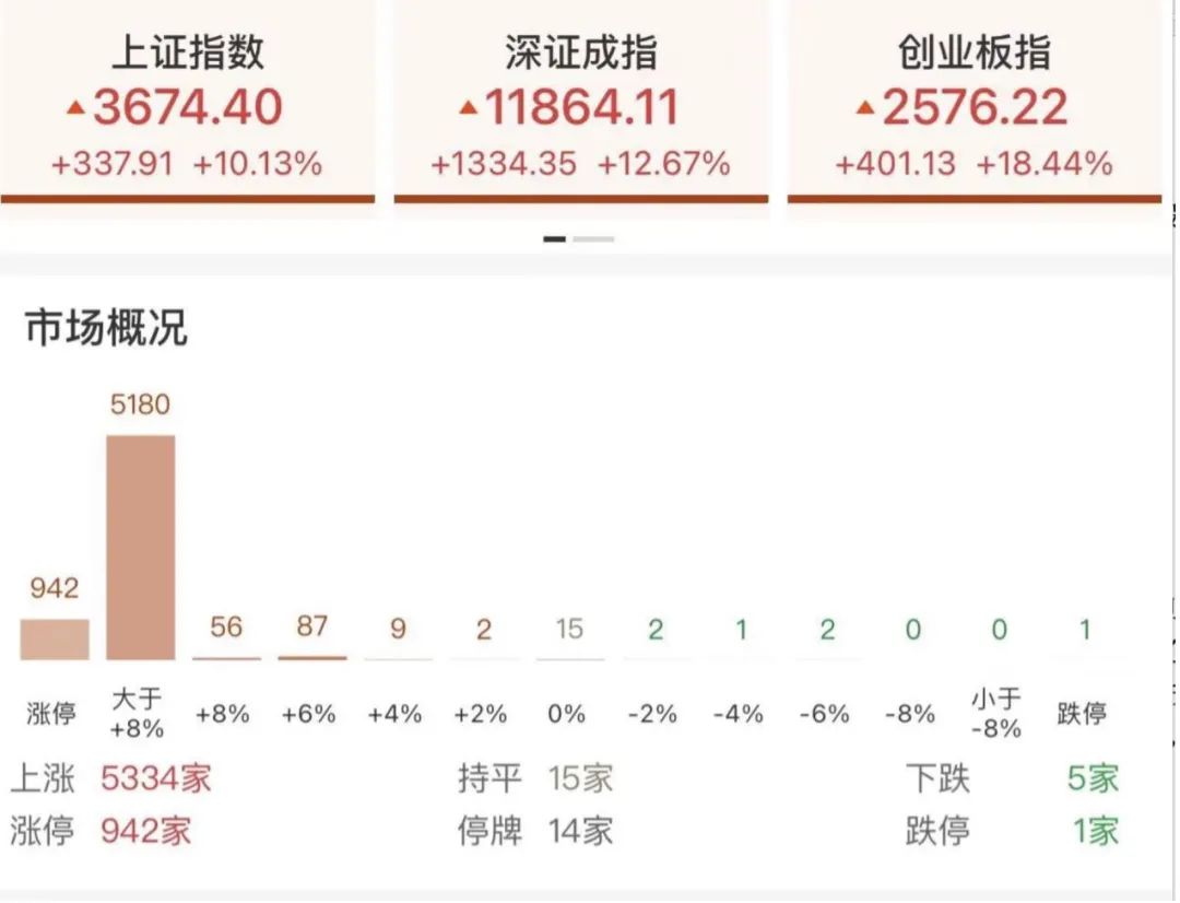 10月8日,投资者盼望了一个假期的节后首个交易日来了。全天走势惊心动魄,大幅高开,上证指数大涨10.13%,深证成指涨幅12.67%,创业板指18.44%,全市场仅5家公司下跌。