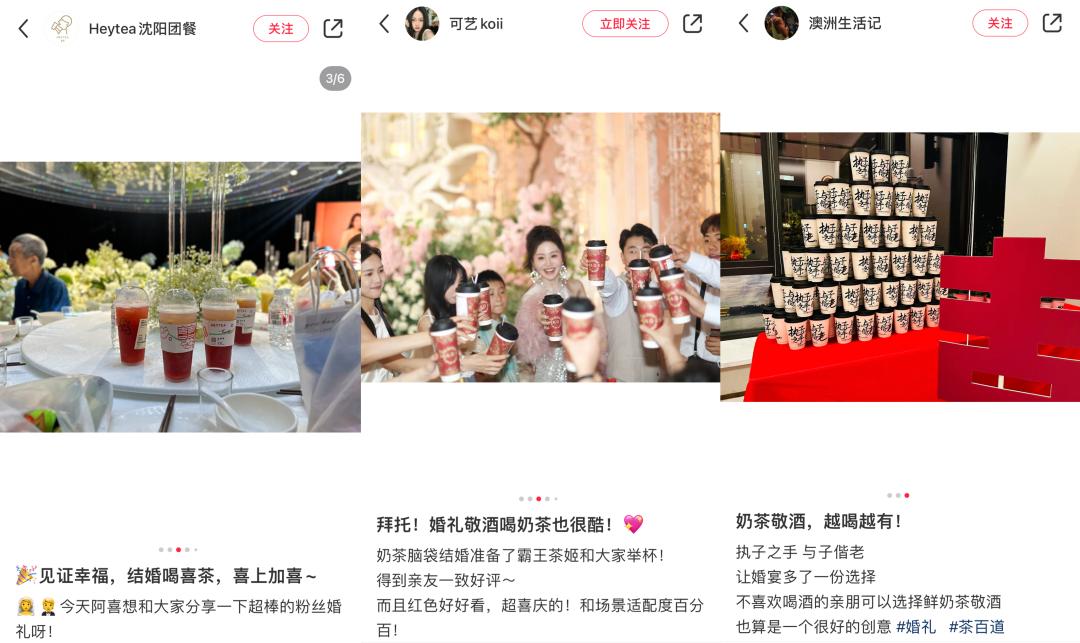 小红书上不断有网友分享婚宴上用奶茶敬酒的瞬间。新茶饮除了能代替酒水,也能传递美好,比如喜茶的“喜”与“囍”字同音,放在婚宴上有很好的寓意,结婚喝喜茶更是囍上加喜;霸王茶姬的大红色定制杯也非常适合喜庆的场景,和婚礼的适配度极高;茶百道在23年七夕推出的限定表白杯上印有“执子之手”“与子偕老”等字样,也正好被用来摆在婚宴上增添喜气。