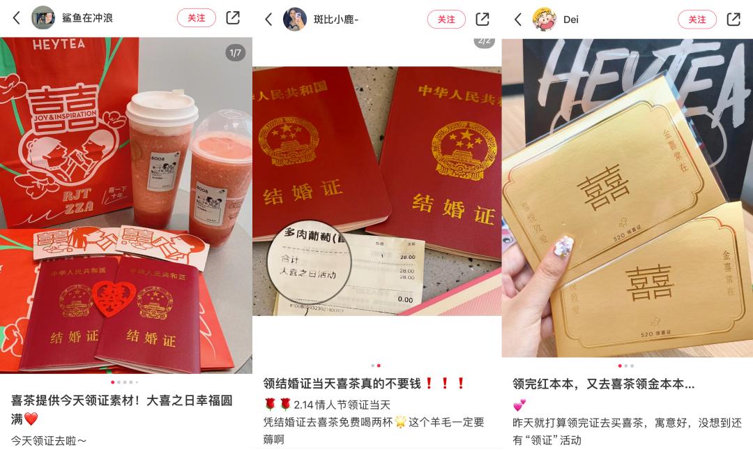 喜茶自2022年起,正式推出了“喝喜茶,领喜证”的活动,持续在情人节、520、七夕等节点,为情侣、新人带来更具仪式感的祝福。