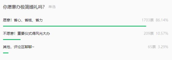 从央广网发起的投票结果也可以看出,有超八成年轻人表示愿意办一场极简婚礼,他们认为省心、省钱、省力,自己幸福最重要。