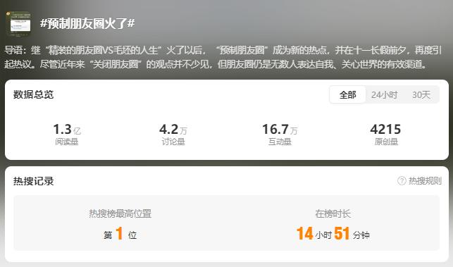 虽然前段时间还在讨论年轻人为什么开始逃离朋友圈,但朋友圈毕竟还是无数人表达自我的有效渠道。国庆长假前一天,话题#预制朋友圈火了#就登上热搜榜榜一。