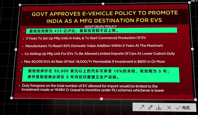 直到临近今年大选,莫迪才终于松口,明文把进口电车的税收从 70% 降到 15%,不过获得税收优惠的条件嘛。。。还是得企业承诺在三年内至少投资 415 亿卢比,而且还是得在印度建厂。关税降了,但也没降。
