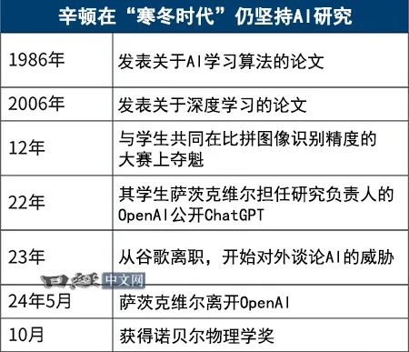 辛顿在美国谷歌工作了约10年,2023年离职,开始公开谈论AI给人类带来的威胁。他的学生萨茨克维尔也仿佛追随他一般而离开OpenAI,创立了注重安全性的AI初创企业。