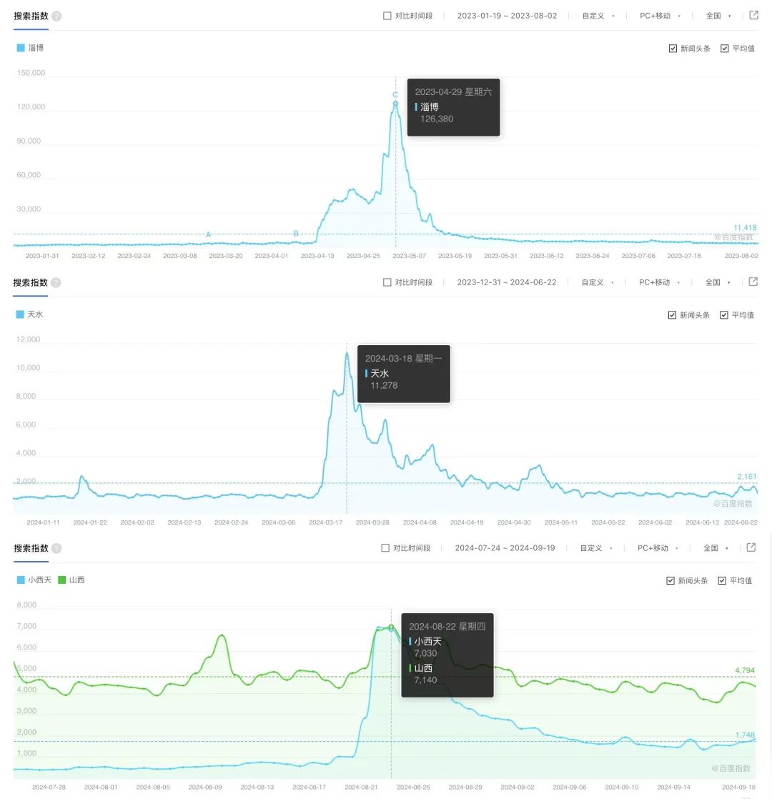 百度指数显示,淄博的搜索指数在2023年的4月29日达到126380的峰值,天水的搜索指数则是在2024年3月18日达到峰值11278。山西作为更常见的省份名称,搜索指数常年均指在4280左右,而在《黑神话:悟空》爆火后,山西的搜索指数峰值也不过达到7140,而真正被游戏带火的小西天,虽然搜索指数暴涨7倍,但峰值也仅有7127。