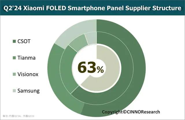 2024年第二季度,小米柔性OLED手机面板供应商中,TCL华星一家就占到了62.6%。三星占比,已降至5.3%。