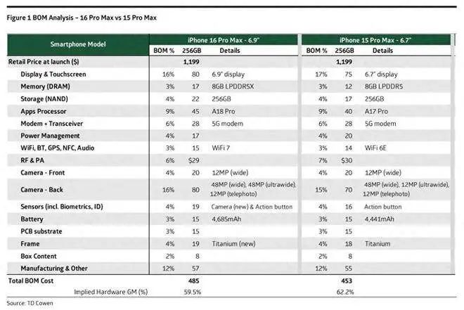 市场调查机构TD Cowen拆解苹果iPhone 16的物料成本后发现,iPhone 16的材料清单为416美元。其中,显示屏的价格最高,为65美元,占比16%。