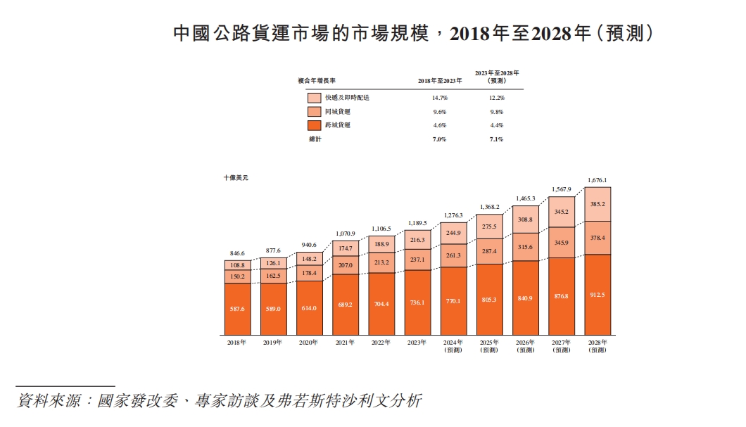弗若斯特沙利文统计,2023年,中国公路货运市场的GTV为1.19万亿美元,占全球市场的32.6%,预计2023年至2028年期间仍会按7.1%的复合年增长率继续增长。