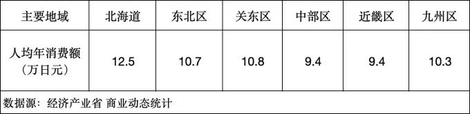 每个地区的消费频度、消费偏好各有不同,日本的各个地区消费者对于便利店利用的差异非常明显。根据经济产业省《商业动态统计》,人均年度消费最高的是北海道,达到12.5万日元。当然,消费频度与地区气候、消费口味、店铺竞争程度有关系,归根结底,源于消费口味的商品特色、店铺密度两种价值取向的不同。