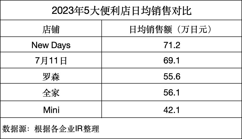 另一个案例是大家不太熟悉的JR东日本运营的车站便利店“New Days”,顾客进入车站想要买食物和饮料,几乎没有其它选择,只能购买他家商品。在这个相对封闭的环境开展业务,New Days的经营效率非常高,2023年平均日销售额达到71.2万日元,超过行业顶级的7-11,更是远超罗森和全家、mini便利店。