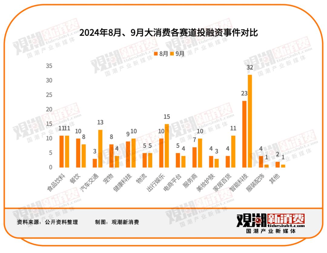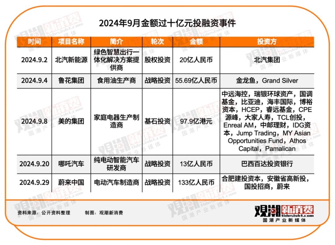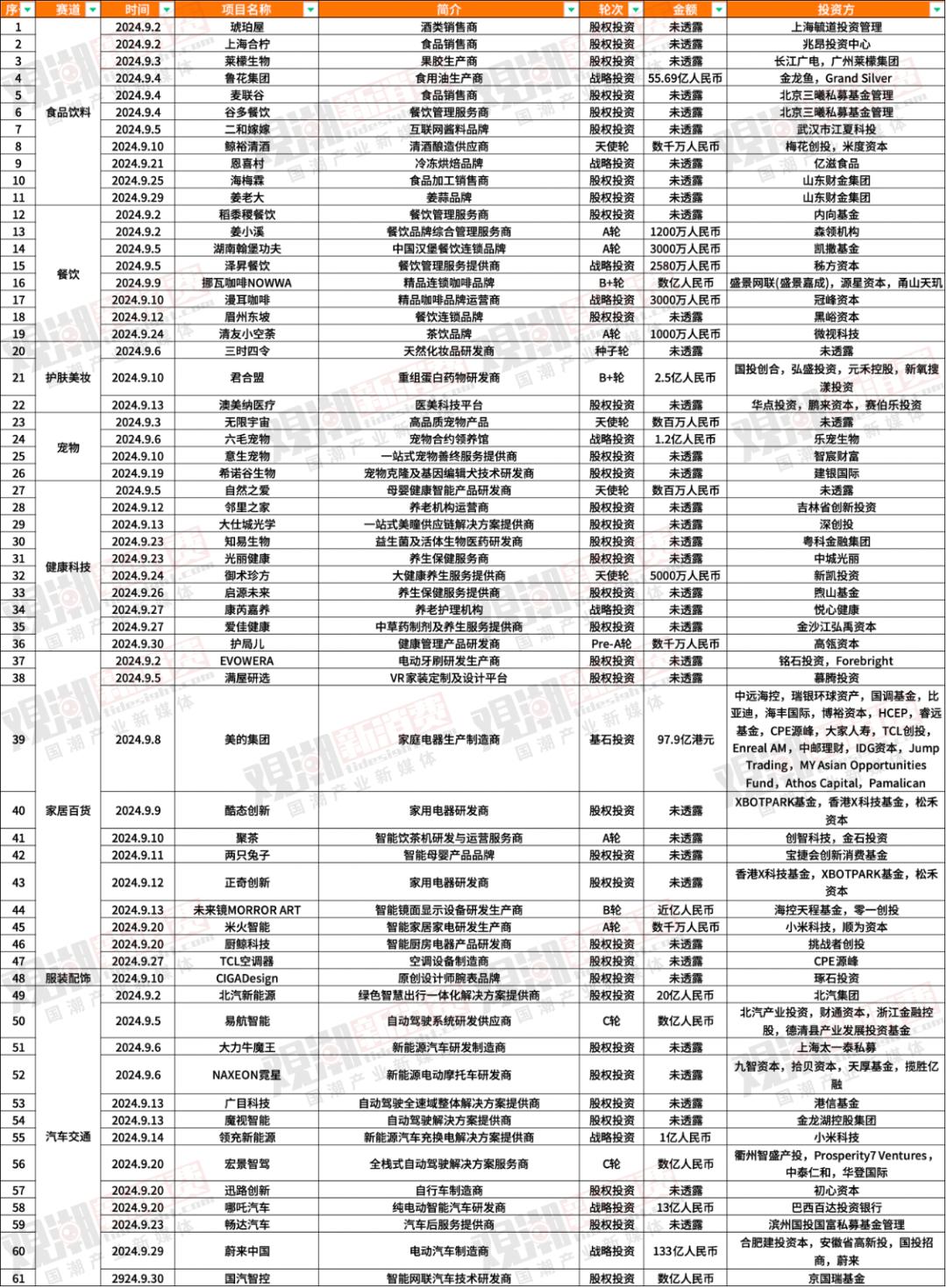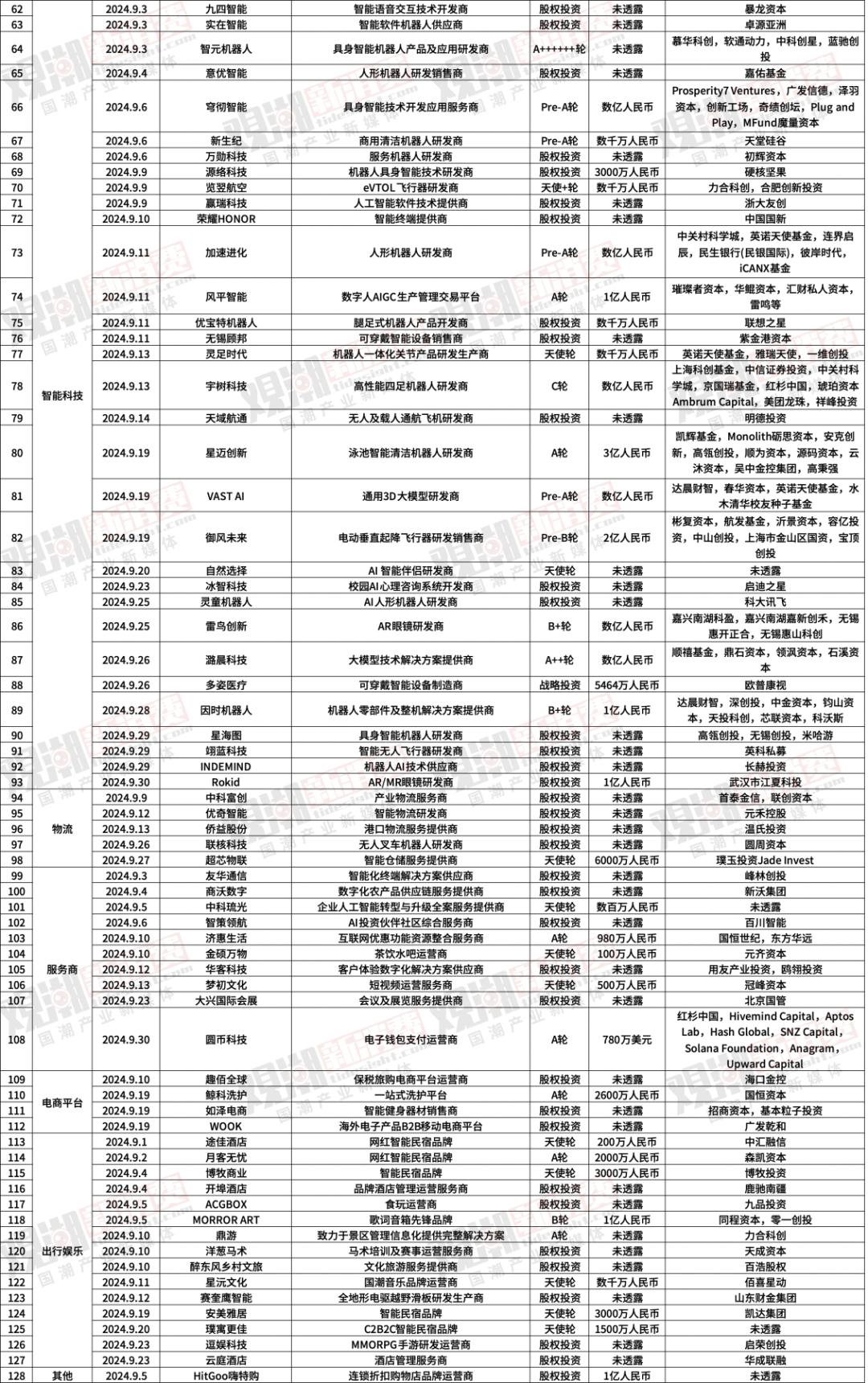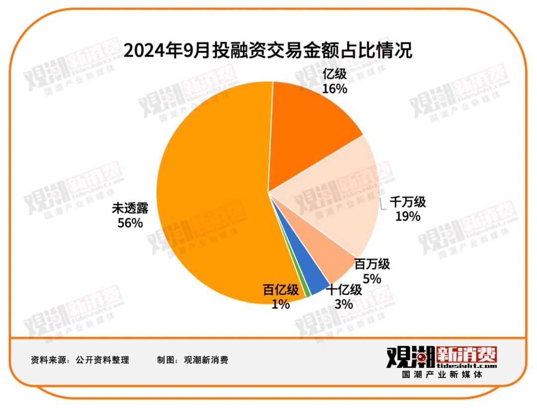 2024年9月,大消费市场共发生128起融资事件,较上月增加20起。其中未披露融资金额的共有72起,其余融资金额合计约353.92亿元,较上月的58亿元增长超500%,消费市场重新火热起来。