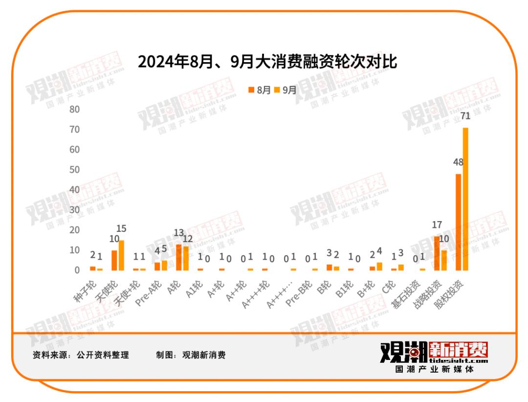 2024年9月,大消费领域投融资事件轮次集中在股权投资,共产生71件,占比55.47%。股权投资以外,本月的投融资事件仍以早期融资为主,其中A轮及以前轮次事件共36起,占比28.13%。