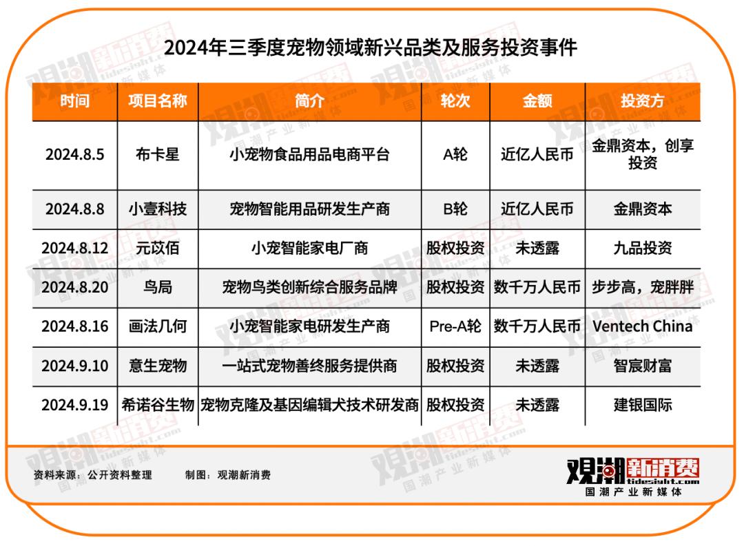 宠物赛道,除了持续火热以外,服务和品类也不断增多。 从2024年三季度的宠物赛道投融资事件来看,除了常见的宠物用品食品,还包括小宠用品、宠物智能家电、善终服务等新兴细分赛道。根据高盛报告预测,到2030年中国的宠物数量将接近幼儿数量的两倍。如此惊人的数据,造就了一条超乎想象的黄金赛道。