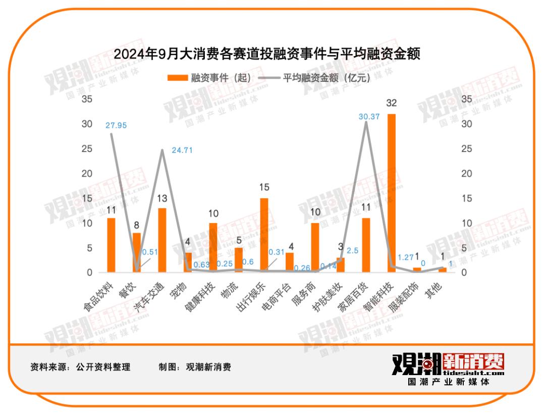 剔除未披露金额的事件,食品饮料、汽车交通、家居百货领域平均融资金额均超20亿元。