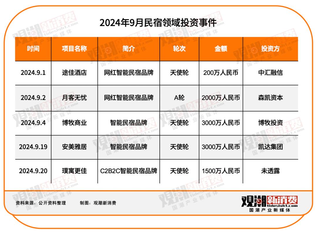 出行娱乐赛道也在9月迎来了高光时刻,其中民宿相关企业融资事件增多,仅本月就产生5起投融资事件。