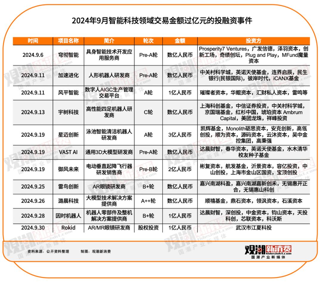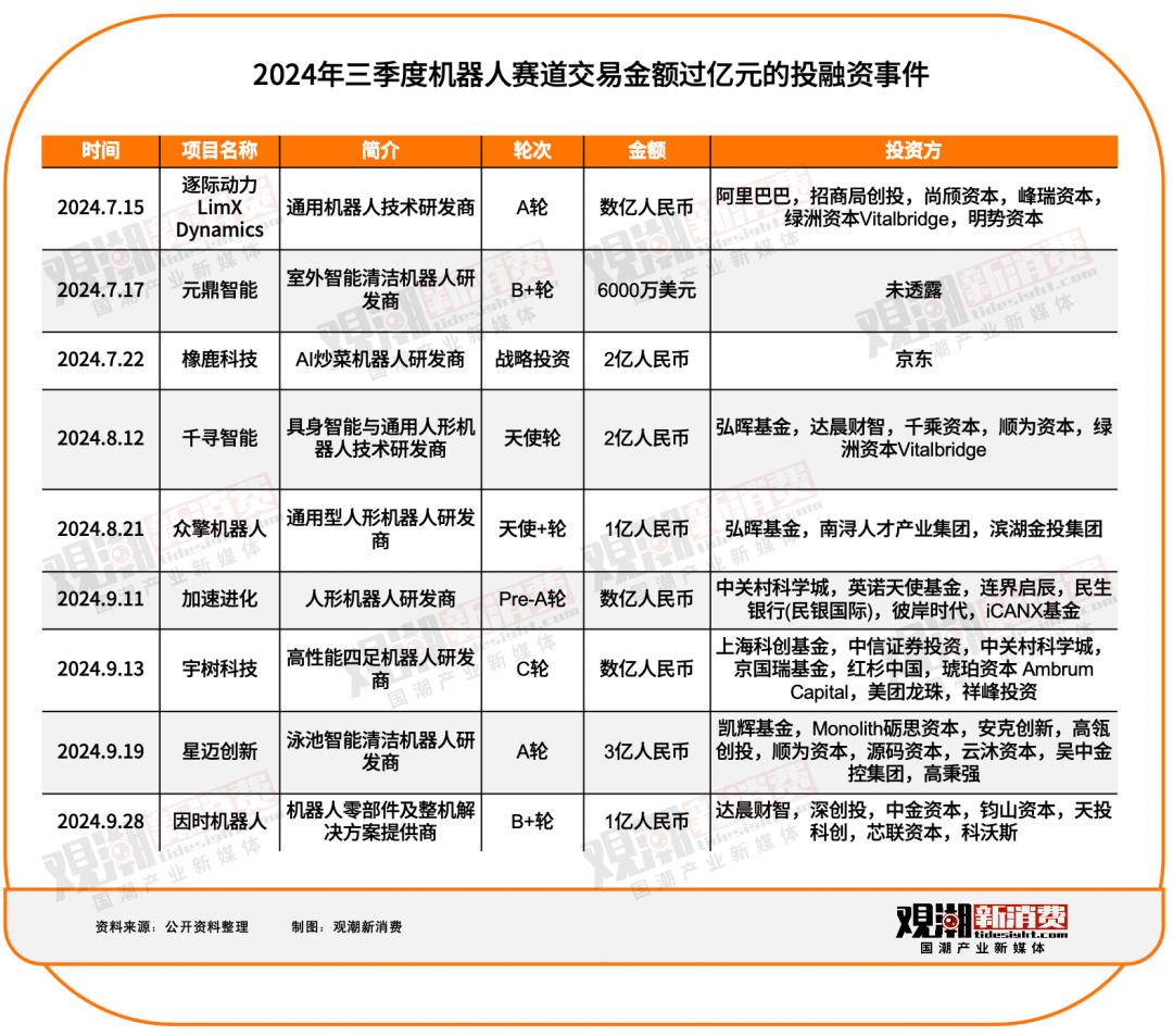 从2024年第三季度的综合情况来看,机器人赛道一直最为活跃,在披露金额的投融资事件中,橡鹿科技、千寻智能、宇树科技等9家机器人企业在三季度获得过亿元融资。
