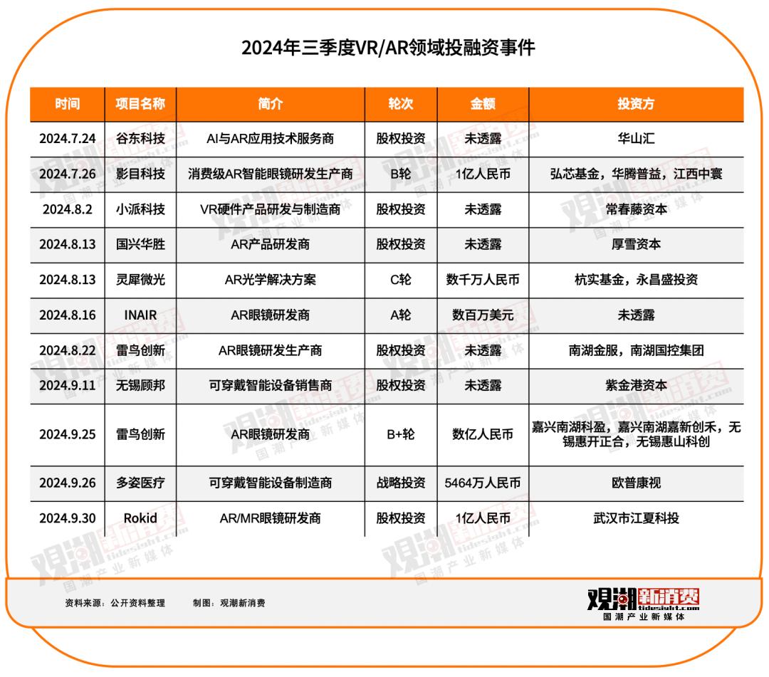 VR/AR在2024年三季度共产生11起投融资事件,9月Rokid和雷鸟创新两大领先品牌均获得融资,领导品牌的多轮融资和持续升级将会带领整体行业进一步发展。